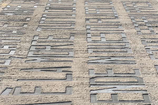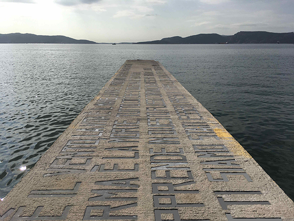 Mystery 95 Epiphany, inlayed text on carved concret pier, permanent site-specific installation commisioned by ELEVSIS 2023, Cultural Capital Of Europe, Sept. 2023, Elefsina, Greece 2023